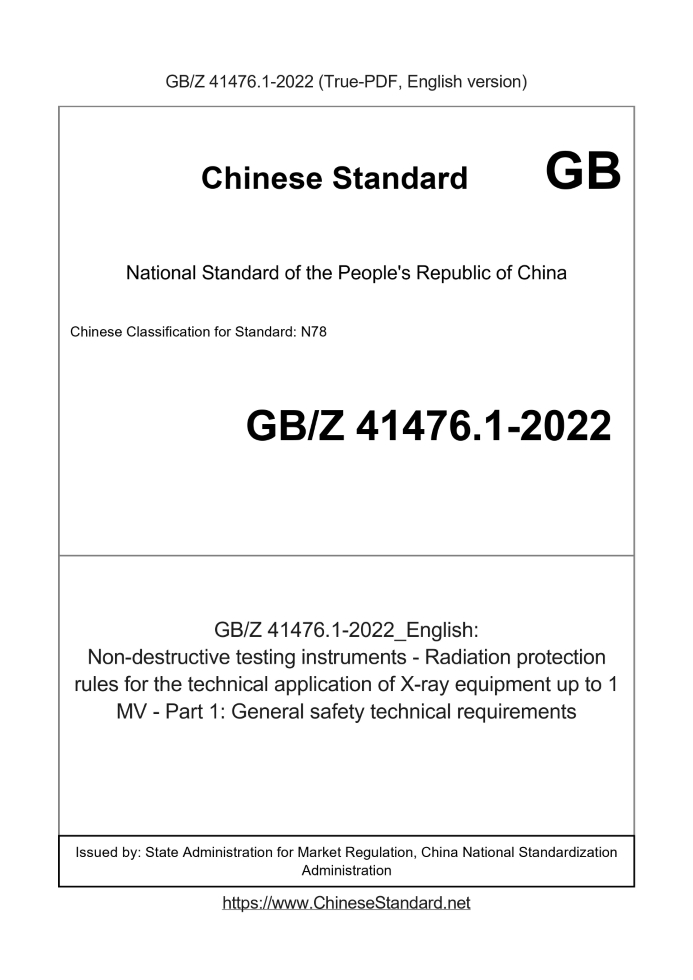 Delivery: <= 3 days. True-PDF full-copy in English will be manually translated and delivered via email. GBZ41476.1-2022: Non-destructive testing instruments - Radiation protection rules for the technical application of X-ray equipment up to 1 MV - Part 1: General safety technical requirements Status: Valid