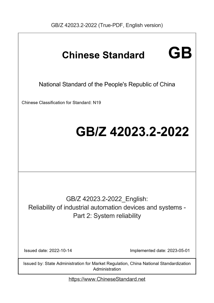 Delivery: <= 3 days. True-PDF full-copy in English will be manually translated and delivered via email. GBZ42023.2-2022: Reliability of industrial automation devices and systems - Part 2: System reliability Status: Valid