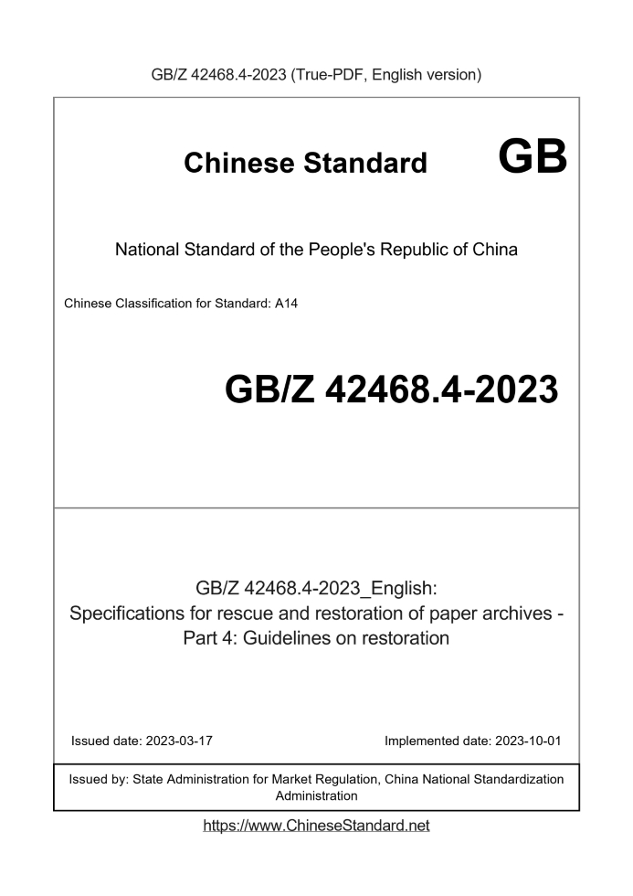 Delivery: <= 3 days. True-PDF full-copy in English will be manually translated and delivered via email. GBZ42468.4-2023: Specifications for rescue and restoration of paper archives - Part 4: Guidelines on restoration Status: Valid