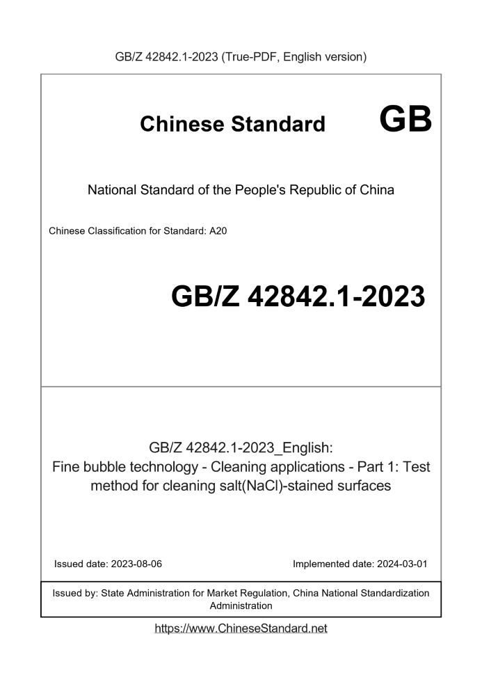 Delivery: <= 3 days. True-PDF full-copy in English will be manually translated and delivered via email. GBZ42842.1-2023: Fine bubble technology - Cleaning applications - Part 1: Test method for cleaning salt(NaCl)-stained surfaces Status: Valid