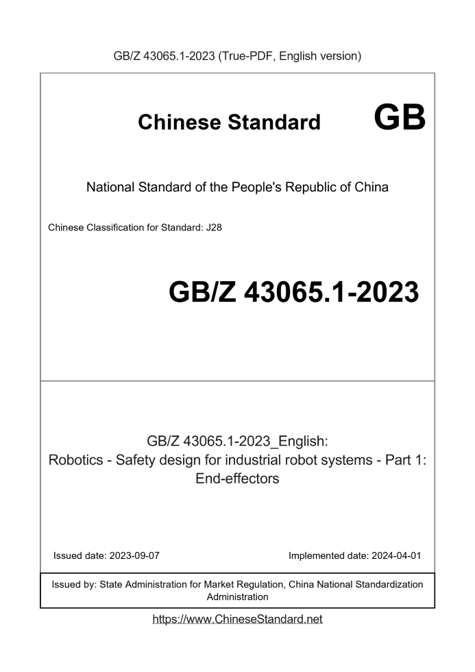 Delivery: <= 5 days. True-PDF full-copy in English will be manually translated and delivered via email. GBZ43065.1-2023: Robotics - Safety design for industrial robot systems - Part 1: End-effectors Status: Valid