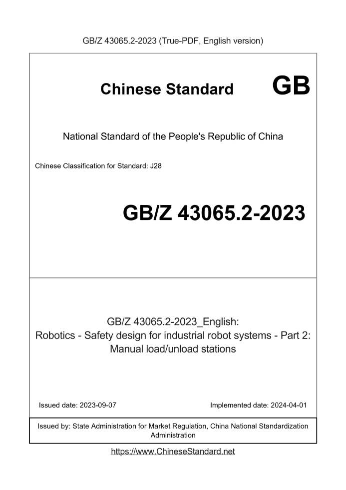 Delivery: <= 4 days. True-PDF full-copy in English will be manually translated and delivered via email. GBZ43065.2-2023: Robotics - Safety design for industrial robot systems - Part 2: Manual load/unload stations Status: Valid
