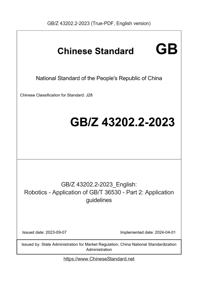 Delivery: <= 5 days. True-PDF full-copy in English will be manually translated and delivered via email. GBZ43202.2-2023: Robotics - Application of GB/T 36530 - Part 2: Application guidelines Status: Valid