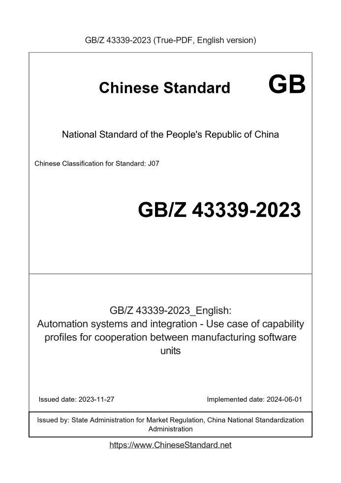 Basic dataStandard ID: GB/Z 43339-2023 (GB/Z43339-2023)Description (Translated English): Automation systems and integration - Use case of capability profiles for cooperation between manufacturing software units Sector / Industry: National Standard Classification of Chinese Standard: J07 Classification of International Standard: 25.040.40 Word Count Estimation: 61,679 Date of Issue: 2023-11-27 Date of Implementation: 2024-06-01 Issuing agency(ies): State Administration for Market Regulation, China National Standardization Administration GBZ43339-2023: Automation systems and integration - Use case of capability profiles for cooperation between manufacturing software units---This is a DRAFT version for illustration, not a final translation. Full copy of true-PDF in English version (including equations, symbols, images, flow-chart, tables, and figures etc.) will be manually/carefully translated upon your order. GB /Z 43339-2023: Specific application cases for interoperability between automation systems and integrated manufacturing software units ICS 25:040:40 CCSJ07 National Standardization Guiding Technical Documents of the People's Republic of China Automation systems and integration Specific application cases for interoperability capabilities between manufacturing software units (ISO /T R16161:2019,IDT) Published on 2023-11-27 2024-06-01 Implementation State Administration for Market Regulation Released by the National Standardization Administration Committee Table of contentsPreface III Introduction IV 1 Scope 1 2 Normative references 1 3 Terms and Definitions 1 4 Abbreviations 2 5 Dialogue content between C subsystem and P subsystem 2 6 Procedures before starting the dialogue between C subsystem and P subsystem 3 6:1 Overview 3 6:2 The process of identifying dialogue partners using competency rules 3 6:3 Competence Specification 6 6:4 Capability-Specific Templates and Examples 6 7 Message definition between C subsystem and P subsystem 15 7:1 Message structure 15 7:2 Control messages 17 7:3 Execution messages 19 8 Communication protocol between C subsystem and P subsystem 25 8:1 Overview 25 8:2 Interface between C subsystem and P subsystem 25 8:3 Message communication in the dialogue between C subsystem and P subsystem 26 Appendix A (informative) Message definitions in JSON schema 28 Appendix B (Informative) Management 35 B:1 Production management system layer 35 B:2 Subsystem 35 B:3 Order example in request message 36 B:4 Collaboration of C subsystem, P subsystem and service provider 38 B:5 CP dialogue basic sequence diagram 39 Appendix C (Informative) Client-Implementer Model 43 Appendix D (Informative) Message Example 44 Appendix E (informative) Customized dialog state transition diagram example 48 E:1 Personalization of the dialogue between C subsystem and P subsystem 48 E:2 Additional messages 48 E:3 Message extensions defined in Appendix A 49 Appendix F (Informative) Solutions for handling dialog state transitions, messages and capability specifications51 F:1 Overview 51 F:2 Design strategies and implementation constraints51 F:3 Main functions of the adopter 51 Appendix G (informative) Verb mapping table between OAGiS and this document53 Reference 54ForewordThis document complies with the provisions of GB/T 1:1-2020 "Standardization Work Guidelines Part 1: Structure and Drafting Rules of Standardization Documents" Drafting: This document is equivalent to ISO /T R16161:2019 "Specialized Application of Interoperability between Automation Systems and Integrated Manufacturing Software Units" Case": The type of this document has been adjusted from ISO 's technical report to my country's national standardization guiding technical document: Please note that some content in this document may be subject to patents: The publisher of this document assumes no responsibility for identifying patents: This document is proposed by China Machinery Industry Federation: This document is under the jurisdiction of the National Automation System and Integration Standardization Technical Committee (SAC/TC159): This document was drafted by: Beijing Machinery Industry Automation Research Institute Co:, Ltd:, Jiangsu Changjiang Intelligent Manufacturing Research Institute Co:, Ltd:, Beijing Institute of Technology, Jiangsu Meike Solar Technology Co:, Ltd:, Deep Blue Ocean Technology Co:, Ltd:, Tsinghua University, Ningbo Grau Bo Intelligent Industry Co:, Ltd:, Changzhou Longxin Intelligent Equipment Co:, Ltd:, Zhejiang University, Guangdong Xinguang Intelligent System Co:, Ltd:, Yuyao Taisu Automation Technology Co:, Ltd:, Tongji University, Shenzhen Xingfengyuan Mechanical and Electrical Co:, Ltd:, Hangzhou Yousheng Technology Co:, Ltd:, Shanghai Xuantian Engineering Industrial Equipment Co:, Ltd:, Chongqing University, Shenzhen Qianhai Hard City Information Technology Co:, Ltd:, Zhejiang Haidman Intelligent Equipment Co:, Ltd:, Xiang Yangmeilixin Technology Co:, Ltd:, Ningbo Zhongyi Intelligent Co:, Ltd:, Shenzhen Huaxin Information Technology Services Co:, Ltd:, Zhejiang Weixin Daycare Automation Technology Co:, Ltd:, Hebei Huatong Technology Co:, Ltd:, Quzhou Xingchen Technology Co:, Ltd: The main drafters of this document: Jiang Jiang, Yin Zuozhong, Pan Yanfei, Chai Senchun, Wei Jiancang, Su Hongye, Sun Jiexiang, Cui Lingguo, Huang Shuangxi, Liu Xianhui, Wang Lei, Li Xiaobin, Wang Haidan, Wang Kai, Guo Dong, Nie Zilin, Qin Xiugong, Mo Tong, Zhao Yixun, Chen Jianping, Zhang Ruitao, Feng Lei, Chen Xingquan, Zhang Wenbo, Mo Mingwei, Li Yue, Yang Zhen, Lan Yu, Lu Yanjun, Zhang Zhilei, Chen Yuanming, Li Liuqi, Jiang Changye, Wei Wei, Liu Jianjun, Zhai Ye, Wu Zhenyong, Qiao Zhongyin, Liu Fuyang, Zheng Jing, Fang Yike:IntroductionISO 16100 is motivated by the industrial and economic environment, in particular: a) Growth base for vendor-specific solutions; b) User difficulties in applying the standard; c) Need to transform into a modular system integration tool set; d) Recognize that application software and t