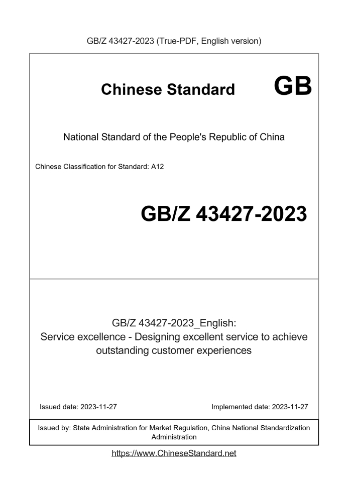 Basic dataStandard ID: GB/Z 43427-2023 (GB/Z43427-2023)Description (Translated English): Service excellence - Designing excellent service to achieve outstanding customer experiences Sector / Industry: National Standard Classification of Chinese Standard: A12 Classification of International Standard: 03.080.01 Word Count Estimation: 29,213 Date of Issue: 2023-11-27 Date of Implementation: 2023-11-27 Issuing agency(ies): State Administration for Market Regulation, China National Standardization Administration GBZ43427-2023: Service excellence - Designing excellent service to achieve outstanding customer experiences---This is a DRAFT version for illustration, not a final translation. Full copy of true-PDF in English version (including equations, symbols, images, flow-chart, tables, and figures etc.) will be manually/carefully translated upon your order. GB /Z 43427-2023: Quality service design high-quality services to achieve the ultimate customer experience ICS 03:080:01 CCSA12 National Standardization Guiding Technical Documents of the People's Republic of China Quality serviceDesign high-quality service to achieve the ultimate customer experience customerexperiences Published on 2023-11-27 Implemented on 2023-11-27 State Administration for Market Regulation Released by the National Standardization Administration Committee Table of contentsPreface III Introduction IV 1 Scope 1 2 Normative references 1 3 Terms and Definitions 1 4 High-Quality Service Design Principles 2 4:1 Overview 2 4:2 Emotional 3 4:3 Adaptation 3 4:4 Co-create with customers 3 4:5 Organizational and customer perspectives 3 5 High Quality Service Design Activities 4 5:1 Overall process 4 5:1:1 Overview 4 5:1:2 Interdependence among high-quality service design activities 4 5:1:3 Design elements for providing high-quality services 5 5:2 Plan high-quality service design projects 5 5:3 Understand and empathize with customers 6 5:3:1 Overview 6 5:3:2 Understand customer needs, expectations and wishes 6 5:3:3 Deep empathy with customers 6 5:4 Determine design direction and unique value proposition 7 5:4:1 Overview 7 5:4:2 Determine design direction 7 5:4:3 Create a unique value proposition 7 5:5 Design the ultimate customer experience through touchpoints and data points 7 5:5:1 Overview 7 5:5:2 Document the ultimate customer experience to be delivered 7 5:5:3 Deploy effective touchpoints 7 5:5:4 Develop effective data points 8 5:6 Designing a co-creation environment 8 5:6:1 Overview 8 5:6:2 Encourage service providers to be customer-centric in service delivery 8 5:6:3 Encourage customers to actively participate in the customer journey 9 5:6:4 Close cooperation between contacts 9 5:7 Evaluating high-quality service design 9 5:7:1 Overview 9 5:7:2 Design evaluation based on customer perspective 9 5:7:3 Design evaluation based on competency perspective 9 5:7:4 Design evaluation based on a sustainable perspective10 Appendix A (informative) Six principles of service design thinking11 Appendix B (Informative) Understanding Unique Value Proposition 12 Appendix C (Informative) Examples of levels of customer and customer-centric service provider involvement14 Appendix D (Informative) Leverage Mechanism to Achieve Customer Delight15 D:1 Overview15 D:2 Structure of Leverage Mechanism15 D:3 Basic services for customer satisfaction16 D:4 High-quality service that delights customers17 Appendix E (Informative) Customer Journey Map 18 E:1 Overview 18 E:2 Journey Mapping Step 18 Reference 21ForewordThis document complies with the provisions of GB/T 1:1-2020 "Standardization Work Guidelines Part 1: Structure and Drafting Rules of Standardization Documents" Drafting: This document is a supporting standard for GB/T 42185-2022 (ISO 23592:2021, IDT): This document is equivalent to ISO /T S24082:2021 "High-quality service design and high-quality services to achieve the ultimate customer experience": Please note that some content in this document may be subject to patents: The publisher of this document assumes no responsibility for identifying patents: This document is proposed and coordinated by the National Service Standardization Technical Committee (SAC/TC264): This document was drafted by: China Institute of Standardization, Beijing Huayou Service Co:, Ltd:, Zhongshi Integrity Credit Rating Co:, Ltd:, Beijing Yan Beijing Beer Co:, Ltd:, Chengxinxing Holdings Co:, Ltd:, China Mobile (Hangzhou) Information Technology Co:, Ltd:, Guangdong Power Grid Co:, Ltd: State Power Supply Bureau, Hill Wisdom (Chengdu) Enterprise Management Consulting Co:, Ltd:, Shaanxi Yuanwang Defense Technology Research Institute Co:, Ltd:, Shenzhen Duoyou Mi Network Technology Co:, Ltd:, Beijing University of Technology, Zhejiang University of Finance and Economics, Zhejiang Institute of Standardization, Shanghai Anshi Intelligent Information Consulting Co:, Ltd: Company, Shandong Dongbo New Energy Holding Development Co:, Ltd:, and Mingshang Technology Co:, Ltd: The main drafters of this document: Zhou Xingyao, Cao Lili, Zheng Juaner, Liu Junge, Guo Xinfeng, Wan Fujun, Geng Chao, Wang Hongjie, Hu Hong, Geng Jie, Hu Tong, Hou Fei, Wang Nana, Mai Shaohui, Yang Zhen, Liu Na, Zhang Yuchen, Li Xiyu, Yin Hang, Zheng Pei, Yao Wangping, Li Ke, Jiang Zhizhou, Xie Guangjun, Xu Yuexiang, Li Li, Fang Xuyang, Shen Jiaming, Zheng Xueqing, Tian Jie, Ma Libo, Peng Peng:IntroductionIn today's highly competitive world, customer expectations are constantly changing and rising: Organizations must create better, more personalized customers experience to maintain and increase its customer base: Therefore, as a basis for service design, organizations must understand customers' expectations, needs, and desires: High-quality service can make customers feel happy and is the key to achieving the ultimate customer experience: The organization connects with customers by providing high-quality services Building stable and good relationships can help you stand out from your competitors: ISO 23592 def