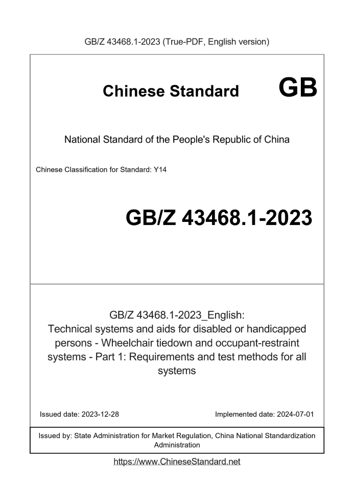 | GBZ43468.1-2023 English PDFUS$1554.00 · In stock Delivery: <= 10 days. True-PDF full-copy in English will be manually translated and delivered via email. GBZ43468.1-2023: Technical systems and aids for disabled or handicapped persons - Wheelchair tiedown and occupant-restraint systems - Part 1: Requirements and test methods for all systems Status: Valid
