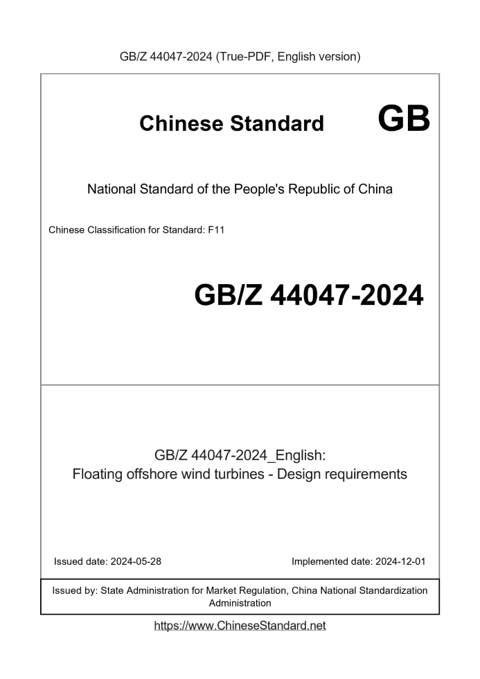 Delivery: <= 6 days. True-PDF full-copy in English will be manually translated and delivered via email. GBZ44047-2024: Floating offshore wind turbines - Design requirements Status: Valid