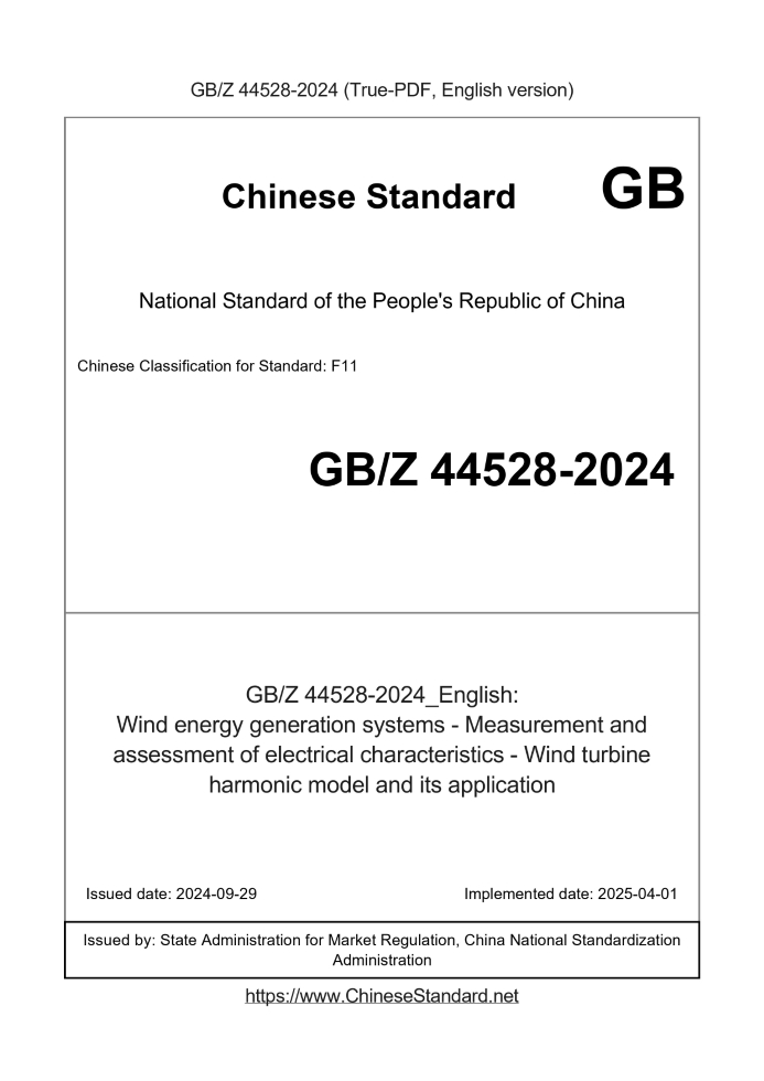 Basic dataStandard ID: GB/Z 44528-2024 (GB/Z44528-2024)Description (Translated English): Wind energy generation systems - Measurement and assessment of electrical characteristics - Wind turbine harmonic model and its application Sector / Industry: National Standard Classification of Chinese Standard: F11 Classification of International Standard: 27.180 Word Count Estimation: 26,291 Date of Issue: 2024-09-29 Date of Implementation: 2025-04-01 Issuing agency(ies): State Administration for Market Regulation, China National Standardization Administration GBZ44528-2024: Wind energy generation systems - Measurement and assessment of electrical characteristics - Wind turbine harmonic model and its application---This is a DRAFT version for illustration, not a final translation. Full copy of true-PDF in English version (including equations, symbols, images, flow-chart, tables, and figures etc.) will be manually/carefully translated upon your order. GB /Z 44528-2024.Measurement and evaluation of electrical characteristics of wind power generation systems Harmonic model and application of wind turbine generator sets ICS 27.180 CCSF11 Guiding technical documents of the People's Republic of China on national standardization Electrical characteristics measurement and Harmonic model and application for evaluating wind turbine generators Released on 2024-09-29 2025-04-01 Implementation State Administration for Market Regulation The National Standardization Administration issued Table of ContentsPreface III Introduction IV 1 Scope 1 2 Normative references 1 3 Terms, definitions and abbreviations 2 3.1 Terms and Definitions 2 3.2 Abbreviations 5 4 Overview 6 4.1 Overview 6 4.2 Background 7 5 Basic requirements and recommendations for wind turbine harmonic models 9 5.1 Overview 9 5.2 Application Scenarios 9 5.3 Input Parameters 10 5.4 Harmonic Model Port 10 5.5 Output variable 10 5.6 Structure 10 6 Interaction with other standardization documents 11 6.1 GB/T 20320-2023, Appendix D Harmonic Assessment 11 6.2 GB/T 20320-2023, Appendix E Power quality assessment of wind turbines and wind farms 11 7 Harmonic Model 12 7.1 Principle 12 7.2 Thevenin/Norton Equivalent Circuit 12 7.3 Equivalent harmonic voltage/current source 12 7.4 Wind turbine types 14 8 Verification 18 8.1 Principle 18 8.2 Overview 18 8.3 Model Validation 18 8.4 Virtual Grid 18 9 Limitations19 Reference 20 Figure 1 Example of phase angles between harmonic current components, harmonic voltage components and fundamental voltage components 2 Figure 2 Schematic diagram of the main components of a wind farm that affect harmonic performance 6 Figure 3 Example of complex structure of wind farm 7 Figure 4 Example of complex electrical infrastructure at a wind farm 8 Figure 5 Estimated values of harmonic impedance at the connection points specified in Figure 4 8 Figure 6 General harmonic model structure represented by Norton/Thevenin equivalent circuit 11 Figure 7 Main mechanical and electrical components of a Class 3 wind turbine generator set [3] 15 Figure 8 Example of harmonic model structure of a doubly-fed asynchronous generator (DFAG) [13] 16 Figure 9 Main electrical and mechanical components of a Category 4 wind turbine[3] 16 Figure 10 Example of converter harmonic model represented by Thevenin equivalent circuit and wind turbine power circuit [9] 17 Figure 11 Comparison of harmonic voltages in each power range 17 Table 1 Example representation/template of harmonic voltage sources 13 Table 2 Example representation/template of harmonic current sources 13 Table 3 Example representation/template of harmonic equivalent impedance 14ForewordThis document is in accordance with the provisions of GB/T 1.1-2020 "Guidelines for standardization work Part 1.Structure and drafting rules for standardization documents" Drafting. This document is equivalent to IEC TR61400-21-3.2019 "Wind energy generation systems Part 21-3.Measurement and evaluation of electrical characteristics Harmonic model and application of wind turbine generator set. The following minimal editorial changes were made to this document. --- In order to coordinate with the existing standards, the name of the standard is changed to "Measurement of electrical characteristics of wind power generation systems and evaluation of wind turbine harmonics Wave Models and Applications"; --- To be consistent with the main text, the normative reference IEC 60050-415.1999 is adjusted to IEC 60050-415. Please note that some of the contents of this document may involve patents. The issuing organization of this document does not assume the responsibility for identifying patents. This document was proposed by the China Machinery Industry Federation. This document is under the jurisdiction of the National Technical Committee for Standardization of Wind Power Generation (SAC/TC50). This document was drafted by. China Electric Power Research Institute Co., Ltd., Envision Energy Co., Ltd., Windey Energy Technology Group Co., Ltd. Company, Vestas Technology R&D (Beijing) Co., Ltd., Goldwind Science & Technology Co., Ltd., Siemens Gamesa Renewable Energy Technologies (China) Co., Ltd., Shanghai Electric Wind Power Group Co., Ltd., Mingyang Smart Energy Group Co., Ltd., CRRC Shandong Wind Power Co., Ltd. Tianjin Ruiyuan Electric Co., Ltd., State Grid Ningxia Electric Power Co., Ltd. Electric Power Research Institute, Shenzhen Hopewind Electric Co., Ltd., Dongfang Electric Wind Power Co., Ltd., China Huaneng Group Clean Energy Technology Research Institute Co., Ltd., Guodian United Power Technology Co., Ltd. Co., Ltd., Jiangsu Coastal Renewable Energy Technology Innovation Center Co., Ltd., Longyuan Power Group Co., Ltd., State Power Investment Group Innovation Investment Co., Ltd., CRRC Zhuzhou Electric Locomotive Research Institute Co., Ltd. Wind Power Division, CSSC Haizhuang Wind Power Co., Ltd., Sungrow Power Supply Co., Ltd. Company, Shanghai Energy Technology Development Co., Ltd., China Three Gorges Corporation, 