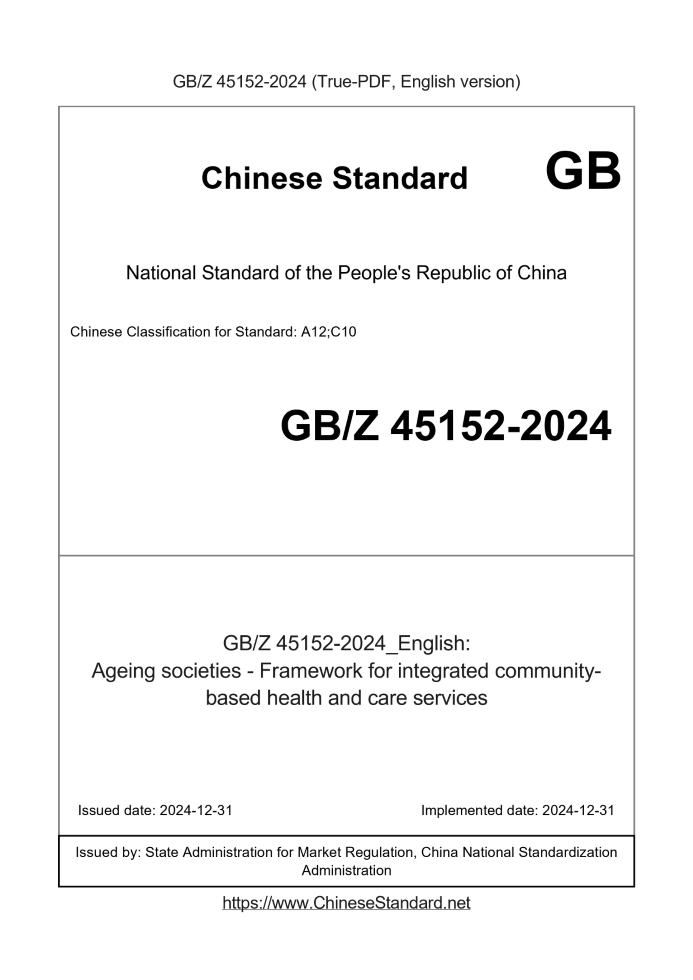 Delivery: <= 5 days. True-PDF full-copy in English will be manually translated and delivered via email. GBZ45152-2024: Ageing societies - Framework for integrated community-based health and care services Status: Valid