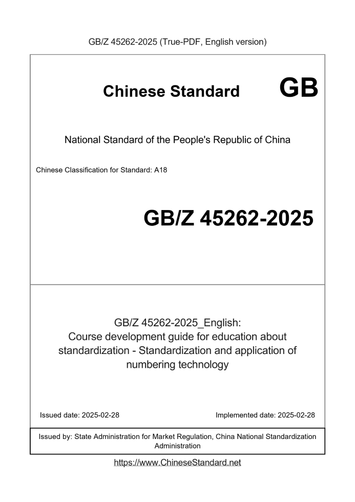 Delivery: <= 5 days. True-PDF full-copy in English will be manually translated and delivered via email. GBZ45262-2025: Course development guide for education about standardization - Standardization and application of numbering technology Status: Valid