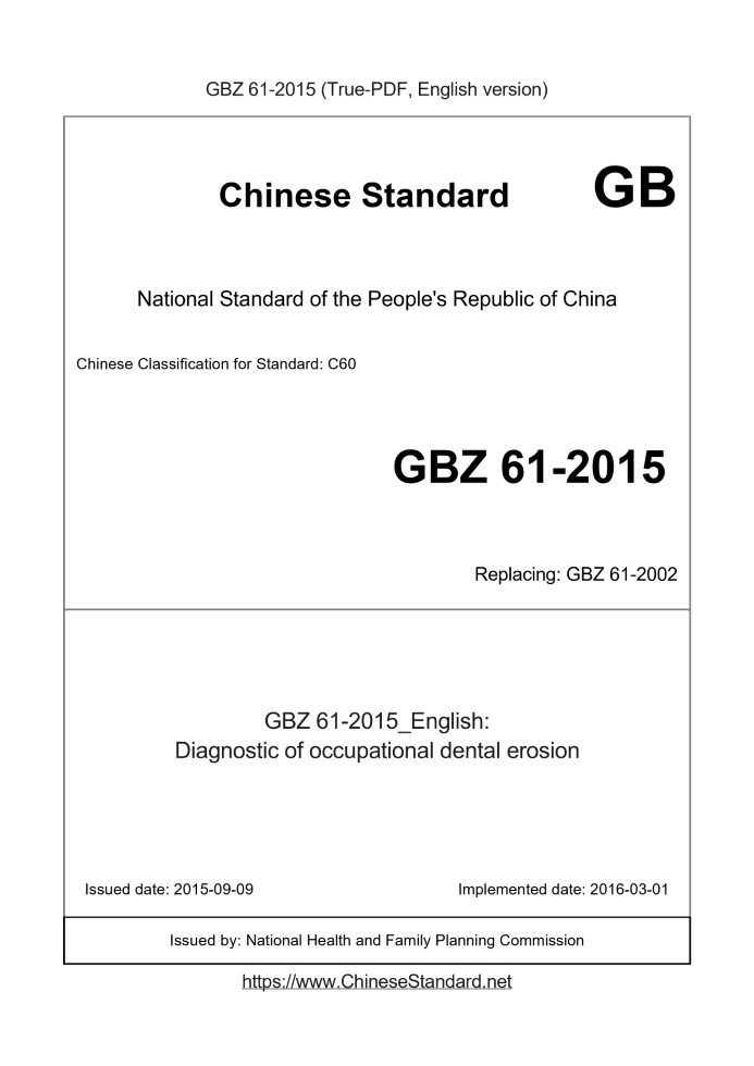 Delivery: <= 3 days. True-PDF full-copy in English will be manually translated and delivered via email. GBZ61-2015: Diagnostic of occupational dental erosion Status: Valid GBZ61: Historical versions