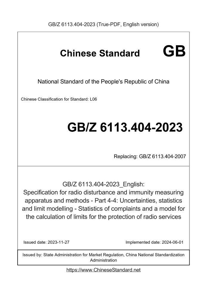 Similar standardsGB/T 6113.103 GB/T 6113.104 GB/T 6113.102 GB/T 6113.402 GB/Z 6113.403 GB/Z 6113.401Basic dataStandard ID: GB/Z 6113.404-2023 (GB/Z6113.404-2023)Description (Translated English): Specification for radio disturbance and immunity measuring apparatus and methods - Part 4-4: Uncertainties, statistics and limit modelling - Statistics of complaints and a model for the calculation of limits for the protection of radio services Sector / Industry: National Standard Classification of Chinese Standard: L06 Classification of International Standard: 33.100 Word Count Estimation: 106,149 Date of Issue: 2023-11-27 Date of Implementation: 2024-06-01 Older Standard (superseded by this standard): GB/Z 6113.404-2007 Issuing agency(ies): State Administration for Market Regulation, China National Standardization Administration GBZ6113.404-2023: Specification for radio disturbance and immunity measuring apparatus and methods - Part 4-4: Uncertainties, statistics and limit modelling - Statistics of complaints and a model for the calculation of limits for the protection of radio services---This is a DRAFT version for illustration, not a final translation. Full copy of true-PDF in English version (including equations, symbols, images, flow-chart, tables, and figures etc.) will be manually/carefully translated upon your order. GB /Z 6113:404-2023: Specification for radio disturbance and immunity measurement equipment and measurement methods Part 4-4: Uncertainty, statistics and limit value modeling Statistics of complaints and limit value calculation model for the protection of radio services ICS 33:100 CCSL06 National Standardization Guiding Technical Documents of the People's Republic of China Replace GB /Z 6113:404-2007 Radio disturbance and immunity measurement equipment and Measurement method specifications Part 4-4: Uncertainty, Statistics and Limits Modeling Complaint Statistics and Protecting Radio Business limit calculation model (CISPRTR16-4-4:2020,IDT) Published on 2023-11-27 and implemented on 2024-06-01 State Administration for Market Regulation Released by the National Standardization Administration Committee Table of contentsPreface III Introduction V 1 Scope 1 2 Normative references 1 3 Terms, definitions, symbols and abbreviations 1 3:1 Terms and definitions 1 3:2 Symbols and abbreviations 2 4 Complaint statistics and sources of interference 2 4:1 Introduction and History 2 4:2 The relationship between RFIs and complaints 3 4:3 A valuable indicator that tends to be lost: interference complaints 3 4:4 Compilation of statistical data on interference complaints and interference source classification recommended by CISPR 3 4:5 Interference complaint statistical format 4 5 Calculation model for limit values 8 5:1 Overview 8 5:2 Interference probability 9 5:3 Interference environment 11 5:4 Mathematical basis for calculating CISPR limits18 5:5 Application of mathematical foundations 19 5:6 Another method suitable for equipment in the frequency range of 150kHz~1GHz 26 5:7 Principles for determining CISPR limits in the frequency range above 1GHz 36 Appendix A (informative) Values of power supply decoupling coefficient in the range of 0:1MHz~200MHz (extracted from CISPR Report No: 31) 46 Appendix B (informative) Conversion of magnetic field limits at different measurement distances below 30MHz 50 Appendix C (informative) Model for estimating radiation from photovoltaic power generation systems 60 Appendix D (informative) Model for estimating radiation from indoor extra-low voltage (ELV) lighting equipment86 Reference 98ForewordThis document complies with the provisions of GB/T 1:1-2020 "Standardization Work Guidelines Part 1: Structure and Drafting Rules of Standardization Documents" Drafting: GB/T (Z) 6113 "Specification for Radio Disturbance and Immunity Measurement Equipment and Measurement Methods" is the basic standard for electromagnetic compatibility: This document is Part 4-4 of GB/T (Z) 6113: GB/T (Z)6113 has released the following parts: Part 1: Radio disturbance and immunity measurement equipment ---Part 1-1: Radio disturbance and immunity measurement equipment Measuring equipment; ---Part 1-2: Coupling device for conductive disturbance measurement of radio disturbance and immunity measuring equipment; ---Part 1-3: Radio disturbance and immunity measurement equipment auxiliary equipment disturbance power; ---Part 1-4: Antennas and test sites for radiated disturbance measurements of radio disturbance and immunity measurement equipment; ---Part 1-5: Radio disturbance and immunity measurement equipment 5MHz~18GHz antenna calibration site and reference test site; ---Part 1-6: Radio disturbance and immunity measurement equipment EMC antenna calibration: Part 2: Radio disturbance and immunity measurement methods ---Part 2-1: Radio disturbance and immunity measurement methods Conducted disturbance measurement; ---Part 2-2: Radio disturbance and immunity measurement methods Disturbance power measurement; ---Part 2-3: Radio disturbance and immunity measurement methods Radiated disturbance measurement; ---Part 2-4: Radio disturbance and immunity measurement methods Immunity measurement; ---Part 2-5: On-site measurement of harassment emissions from large equipment: Part 3: Radio disturbance and immunity measurement technical report ---Part 3: Radio disturbance and immunity measurement technical report: Part 4: Uncertainty, Statistics and Limit Modeling ---Part 4-1: Uncertainty, statistics and limit value modeling Uncertainty of standardized EMC tests; ---Part 4-2: Uncertainty, statistics and limit value modeling Uncertainty of measuring equipment and facilities; ---Part 4-3: Uncertainty, Statistics and Limit Value Modeling Statistical considerations for EMC compliance determination of batch products; ---Part 4-4: Uncertainty, statistics and limit modeling Statistics of complaints and limit calculation model for protecting radio services; ---Part 4-5: Conditions for use of uncertainty, stat