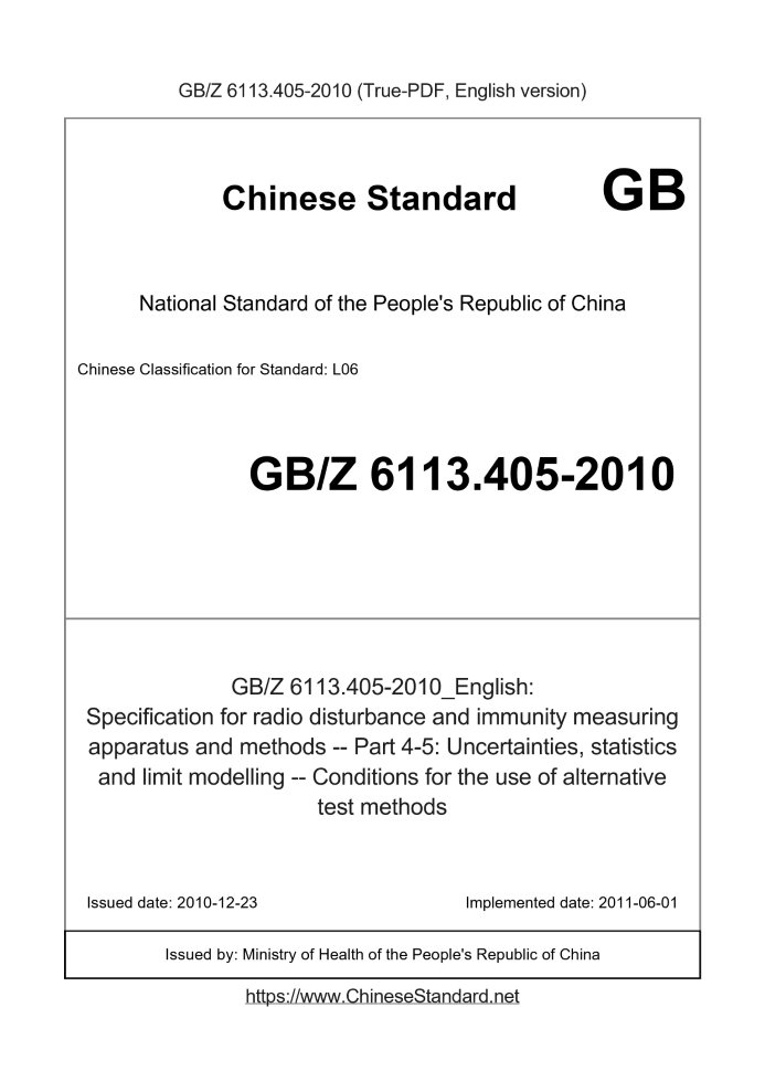 Similar standardsGB/T 6113.103 GB/T 6113.104 GB/T 6113.102 GB/Z 6113.404 GB/T 6113.402 GB/Z 6113.403Basic dataStandard ID: GB/Z 6113.405-2010 (GB/Z6113.405-2010)Description (Translated English): Specification for radio disturbance and immunity measuring apparatus and methods -- Part 4-5: Uncertainties, statistics and limit modelling -- Conditions for the use of alternative test methods Sector / Industry: National Standard Classification of Chinese Standard: L06 Classification of International Standard: 33.100 Word Count Estimation: 41,484 Date of Issue: 2010-12-23 Date of Implementation: 2011-06-01 Quoted Standard: GB/T 4365-2003; GB/Z 6113.401-2007; GB/T 6113.402-2006 Adopted Standard: CISPR 16-4-5/TR-2006, IDT Regulation (derived from): ?National Standard Approval Announcement 2010 No.10 (Total No.165) Issuing agency(ies): Ministry of Health of the People's Republic of China Summary: This standard specifies the method of conversion between the two limits. Upcoming " test method to determine the " in " determining the limits " into " the replacement test method " in the " export limits. " In general, this method is applicable to all types of harassment measure, but more focused on radiated disturbance measurements (such as field strength), because the current test method has been replaced by some of the provisions of the field strength measurements. Commission and other organizations when the product is responsible for setting emission limits determined using the replacement test method and corresponding limits in product standards can be achieved using this method limits the conversion. GBZ6113.405-2010: Specification for radio disturbance and immunity measuring apparatus and methods -- Part 4-5: Uncertainties, statistics and limit modelling -- Conditions for the use of alternative test methods---This is a DRAFT version for illustration, not a final translation. Full copy of true-PDF in English version (including equations, symbols, images, flow-chart, tables, and figures etc.) will be manually/carefully translated upon your order. Specification for radio disturbance and immunity measuring apparatus and methods. Part 4-5. Uncertainties, statistics and limit modeling. Conditions for the use of alternative test methods ICS 33.100 L06 People's Republic of China national standardization of technical guidance documents Radio disturbance and immunity measuring equipment and Measurement method specification Part 4-5. Uncertainty, statistics and limit modeling Replacement test methods and conditions of use Part 4-5.Uncertainties, statisticsandlimitmodeling- (CISPR16-4-5/T R.2006, IDT) 2010-12-23.2011-06-01 implementation General Administration of Quality Supervision, Inspection and Quarantine of People's Republic of China China National Standardization Administration released Directory Foreword Ⅲ Introduction Ⅴ 1 Scope 1 2 Normative references 1 3 Terms and definitions 1 4 symbols and abbreviations 2 5 Overview 3 6 Derivation of export test methods to replace the limits of the program 4 Appendix A (informative) EUT modeling instructions 10 Appendix B (Informative) Comparison of test methods application examples 11 References 35 ForewordGB /Z 6113.405 Equivalent CISPRTR16-4-5.2006 (version 1.0) "radio disturbance and immunity measuring equipment and measurement Methods of measurement - Part 4-5. Uncertainty, statistics and limits of use of conditions for the development of alternative test methods, "the entire contents of this section Recommended. In view of CISPR16 series of electromagnetic compatibility as the basic standards, and the length, content, in order to facilitate the development of standards, maintenance and use, In.2002 CISPRA branch decided to make major adjustments to the standard structure, the original four parts is divided into 14 parts, It was increased to 15 in.2006 and has been released since November.2003. Based on the principle of equal use, our country will successively complete the corresponding countries Standard formulation and revision. The new and old national standards in the series of standards and their corresponding CISPR16 series of standards/publications Department is as follows. Old Standard Number and Name New Standard Number and Name GB/T 6113.1-1995 (eqvCISPR16-1.1993) Specification for radio disturbance and immunity measuring equipment GB/T 6113.101-2008 (CISPR16-1-1.2006, IDT) Part 1-1. Radio disturbance and immunity measuring equipment Measuring equipment GB/T 6113.102-2008 (CISPR16-1-2.2006, IDT) Part 1-2 - Radio disturbance and immunity measurement equipment Auxiliary equipment conducted disturbances GB/T 6113.103-2008 (CISPR16-1-3.2004, IDT) Part 1-3. Radio disturbance and immunity measuring equipment Auxiliary equipment Harassment power GB/T 6113.104-2008 (CISPR16-1-4.2005, IDT) Part 1-4. Radio disturbance and immunity measurement equipment Auxiliary equipment Radiation Harassment GB/T 6113.105-2008 (CISPR16-1-5.2003, IDT) Part 1-5. Radio disturbance and immunity measurement equipment 30MHz ~ 1000MHz Antenna calibration test site GB/T 6113.2-1998 (eqvCISPR16-2.1996) Methods of measurement of radio disturbance and immunity GB/T 6113.201-2008 (CISPR16-2-1.2003, IDT) Part 2-1. Radio disturbance and immunity measurement methods Conducted disturbance measurements GB/T 6113.202-2008 (CISPR16-2-2.2004, IDT) Part 2-2. Methods of measurement of radio disturbance and immunity Harassment power measurements GB/T 6113.203-2008 (CISPR16-2-3.2003, IDT) Part 2-3. Methods of measurement of radio disturbance and immunity Harassment measurements GB/T 6113.204-2008 (CISPR16-2-4.2003, IDT) Part 2-4. Methods of measurement of radio disturbance and immunity Immunity measurements GB /Z 6113.205 (CISPR16-2-5/T R.2008, IDT) Part 2-5. Field measurements of harassment emissions from large equipment 1) CISPR16-3.2000 Radio interference and immunity measurement statistical methods and technical reports 3) GB /Z 6113.3-2006 (CISPR16-3.2003, IDT) Part 3. Technical Report on R