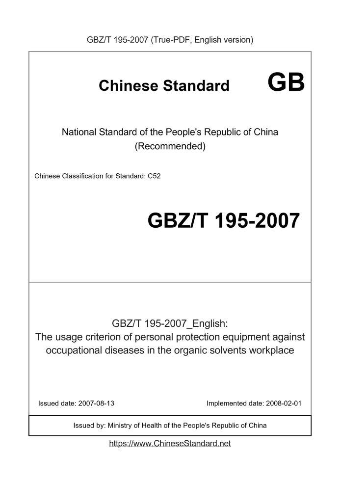 Delivery: <= 4 days. True-PDF full-copy in English will be manually translated and delivered via email. GBZT195-2007: The usage criterion of personal protection equipment against occupational diseases in the organic solvents workplace Status: Valid