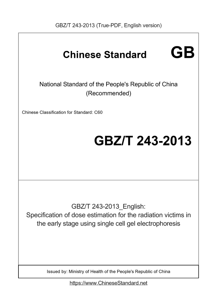 Delivery: <= 3 days. True-PDF full-copy in English will be manually translated and delivered via email. GBZT243-2013: Specification of dose estimation for the radiation victims in the early stage using single cell gel electrophoresis Status: Valid