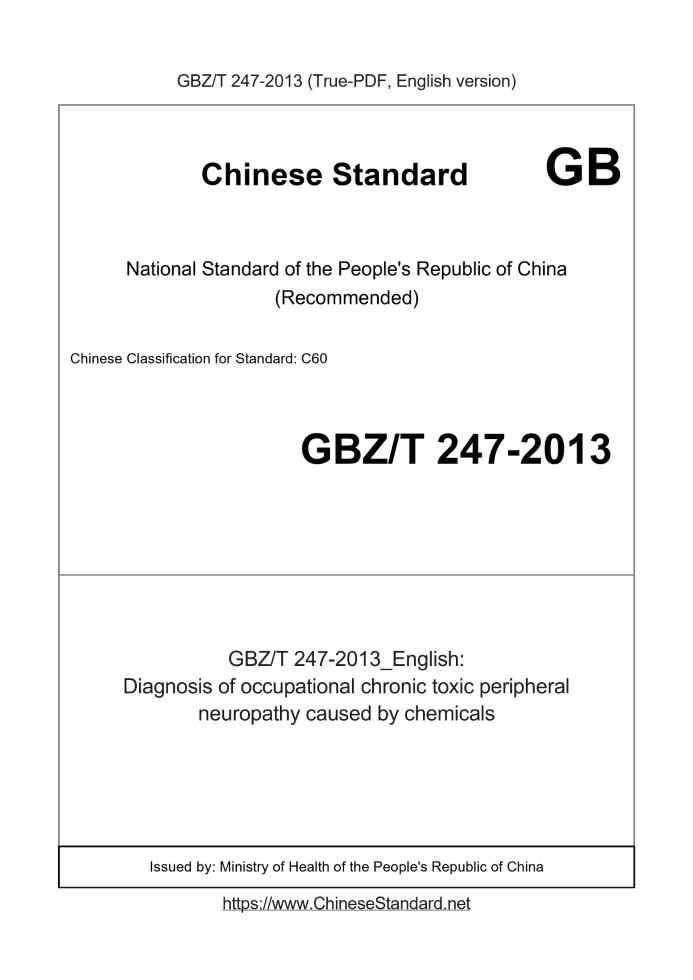 Delivery: <= 3 days. True-PDF full-copy in English will be manually translated and delivered via email. GBZT247-2013: Diagnosis of occupational chronic toxic peripheral neuropathy caused by chemicals Status: Valid