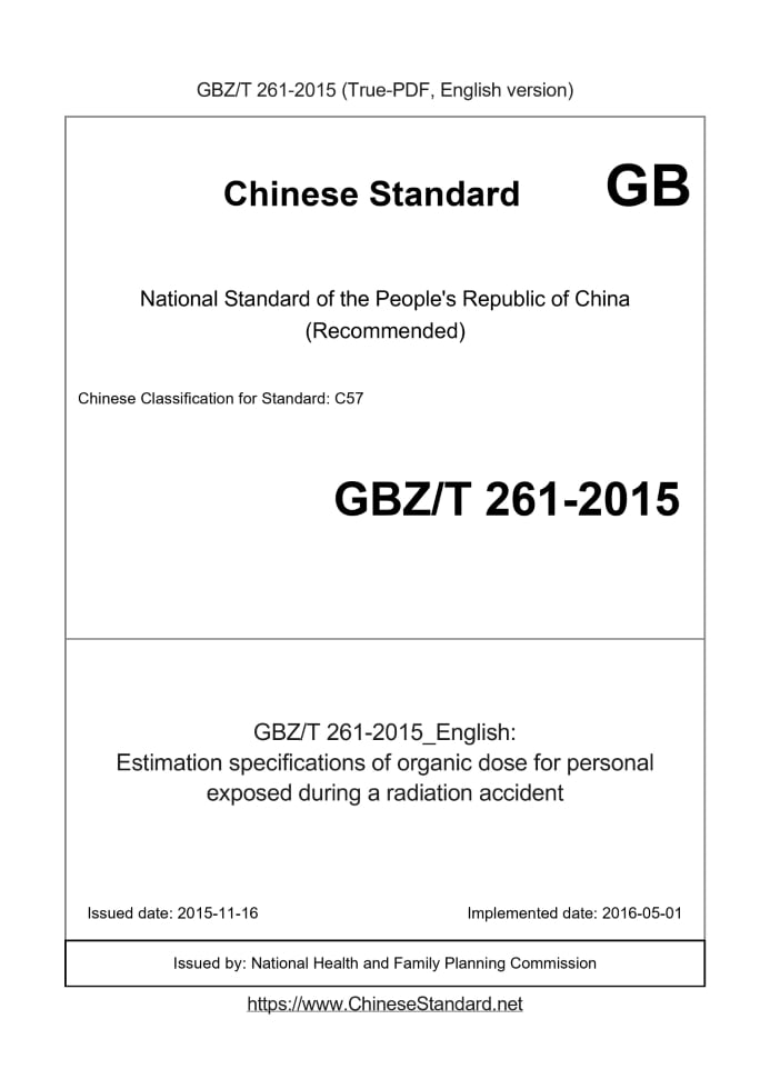 Delivery: <= 5 days. True-PDF full-copy in English will be manually translated and delivered via email. GBZT261-2015: Estimation specifications of organic dose for personal exposed during a radiation accident Status: Valid