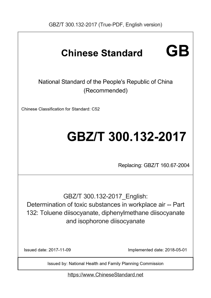 Delivery: <= 3 days. True-PDF full-copy in English will be manually translated and delivered via email. GBZT300.132-2017: Determination of toxic substances in workplace air -- Part 132: Toluene diisocyanate, diphenylmethane diisocyanate and isophorone diisocyanate Status: Valid
