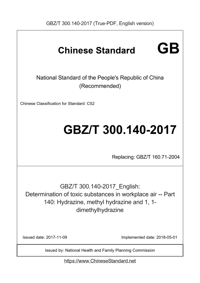 GBZT300.140-2017: Determination of toxic substances in workplace air -- Part 140: Hydrazine, methyl hydrazine and 1, 1-dimethylhydrazine