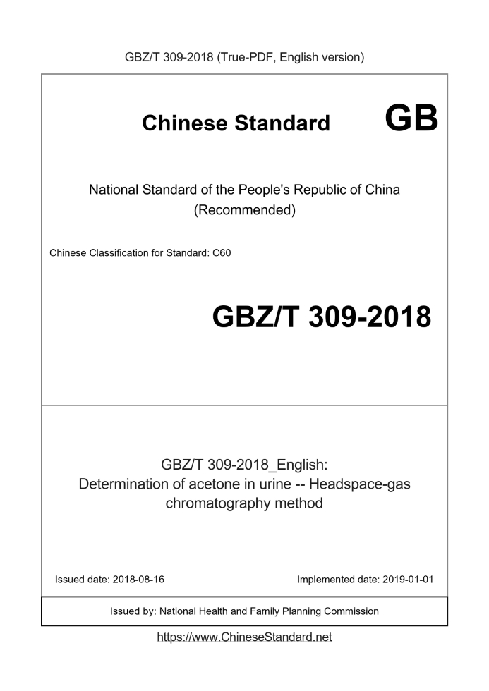 Delivery: <= 3 days. True-PDF full-copy in English will be manually translated and delivered via email. GBZT309-2018: Determination of acetone in urine -- Headspace-gas chromatography method Status: Valid