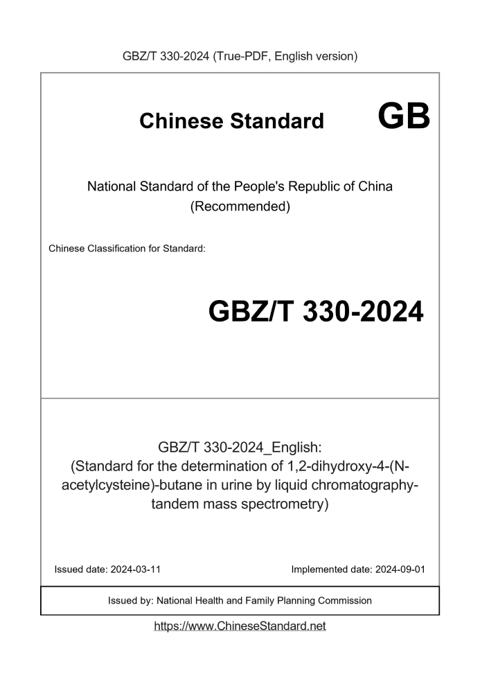 Delivery: <= 3 days. True-PDF full-copy in English will be manually translated and delivered via email. GBZT330-2024: (Standard for the determination of 1,2-dihydroxy-4-(N-acetylcysteine)-butane in urine by liquid chromatography-tandem mass spectrometry) Status: Valid
