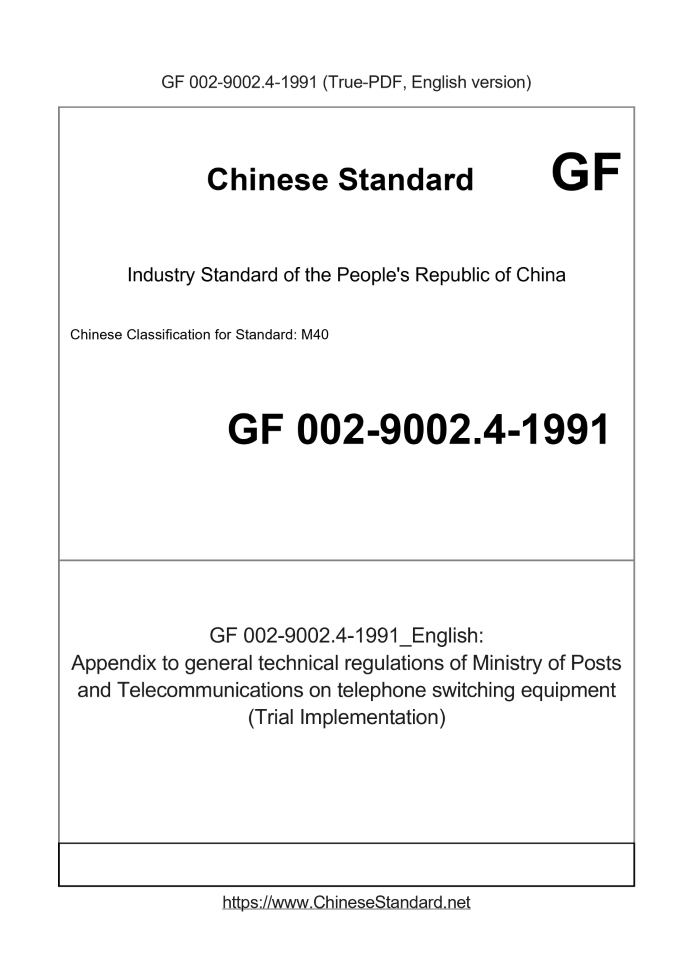 Basic dataStandard ID: GF 002-9002.4-1991 (GF002-9002.4-1991)Description (Translated English): Appendix to general technical regulations of Ministry of Posts and Telecommunications on telephone switching equipment (Trial Implementation) Sector / Industry: Chinese Industry Standard Classification of Chinese Standard: M40 Classification of International Standard: 33.050.10 Word Count Estimation: 154,174 Regulation (derived from): Industry-Science [2009] No. 58 Tips & Frequently Asked Questions:Question 1: How long will the true-PDF of GF002-9002.4-1991_English be delivered?Answer: Upon your order, we will start to translate GF002-9002.4-1991_English as soon as possible, and keep you informed of the progress. The lead time is typically 1 ~ 3 working days. The lengthier the document the longer the lead time.Question 2: Can I share the purchased PDF of GF002-9002.4-1991_English with my colleagues?Answer: Yes. The purchased PDF of GF002-9002.4-1991_English will be deemed to be sold to your employer/organization who actually pays for it, including your colleagues and your employer's intranet.Question 3: Does the price include tax/VAT?Answer: Yes. Our tax invoice, downloaded/delivered in 9 seconds, includes all tax/VAT and complies with 100+ countries' tax regulations (tax exempted in 100+ countries) -- See Avoidance of Double Taxation Agreements (DTAs): List of DTAs signed between Singapore and 100+ countriesQuestion 4: Do you accept my currency other than USD?Answer: Yes. If you need your currency to be printed on the invoice, please write an email to Sales@ChineseStandard.net. In 2 working-hours, we will create a special link for you to pay in any currencies. Otherwise, follow the normal steps: Add to Cart -- Checkout -- Select your currency to pay. |