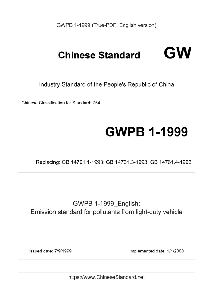 Delivery: <= 4 days. True-PDF full-copy in English will be manually translated and delivered via email. GWPB1-1999: Emission standard for pollutants from light-duty vehicle Status: Obsolete
