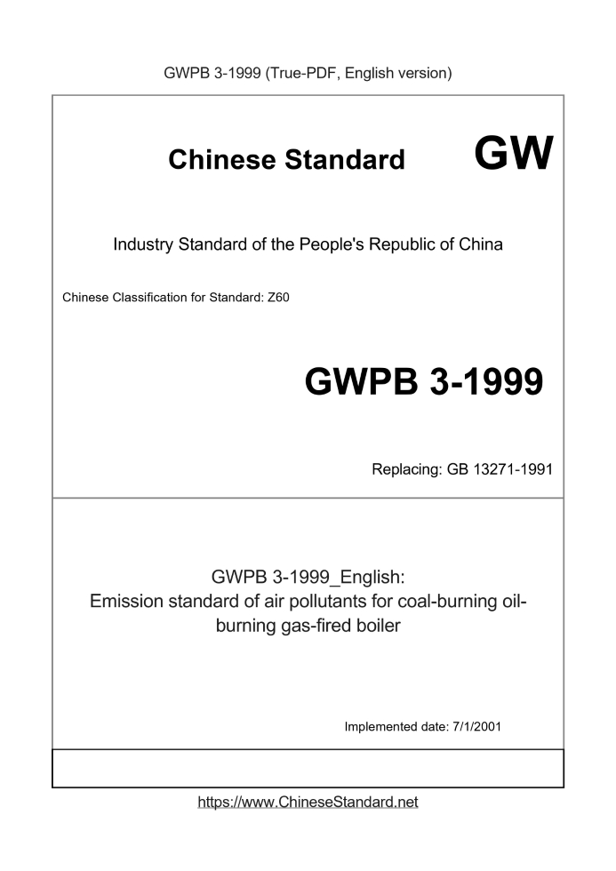 Delivery: <= 3 days. True-PDF full-copy in English will be manually translated and delivered via email. GWPB3-1999: Emission standard of air pollutants for coal-burning oil-burning gas-fired boiler Status: Obsolete