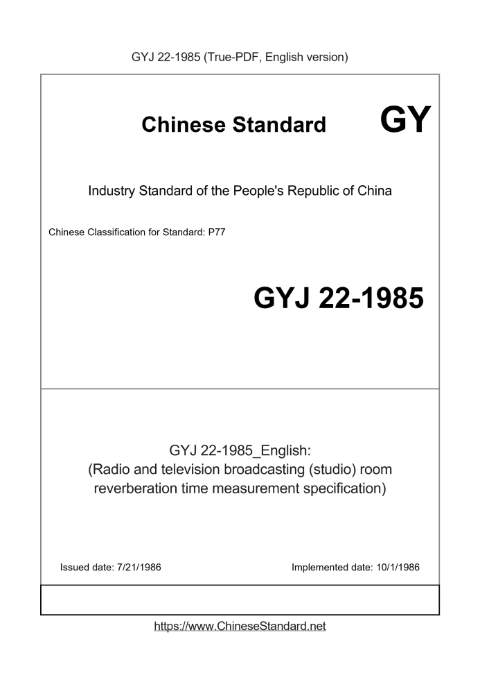 Delivery: <= 3 days. True-PDF full-copy in English will be manually translated and delivered via email. GYJ22-1985: (Radio and television broadcasting (studio) room reverberation time measurement specification) Status: Obsolete