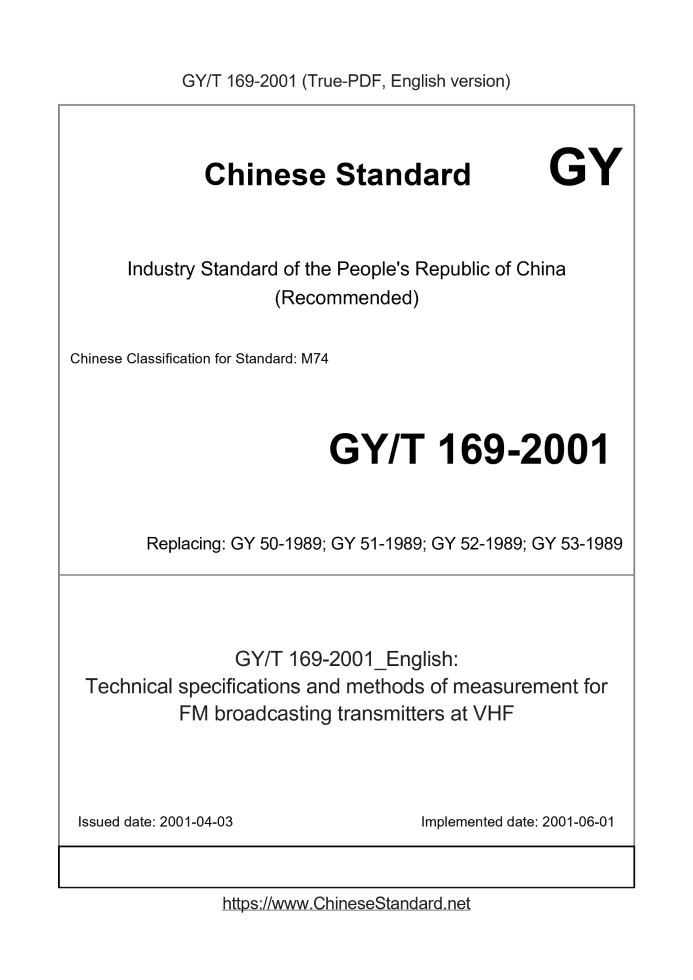 Delivery: <= 3 days. True-PDF full-copy in English will be manually translated and delivered via email. GY/T 169-2001: Technical specifications and methods of measurement for FM broadcasting transmitters at VHF Status: Valid