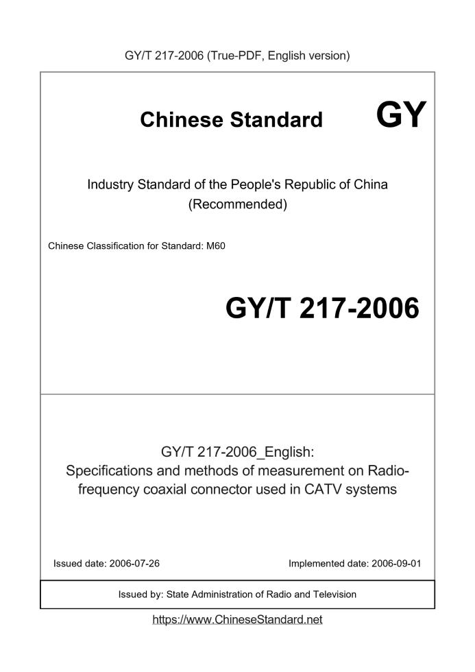 Delivery: <= 3 days. True-PDF full-copy in English will be manually translated and delivered via email. GY/T 217-2006: Specifications and methods of measurement on Radio-frequency coaxial connector used in CATV systems Status: Valid