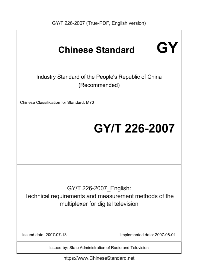 Delivery: <= 3 days. True-PDF full-copy in English will be manually translated and delivered via email. GY/T 226-2007: Technical requirements and measurement methods of the multiplexer for digital television Status: Valid