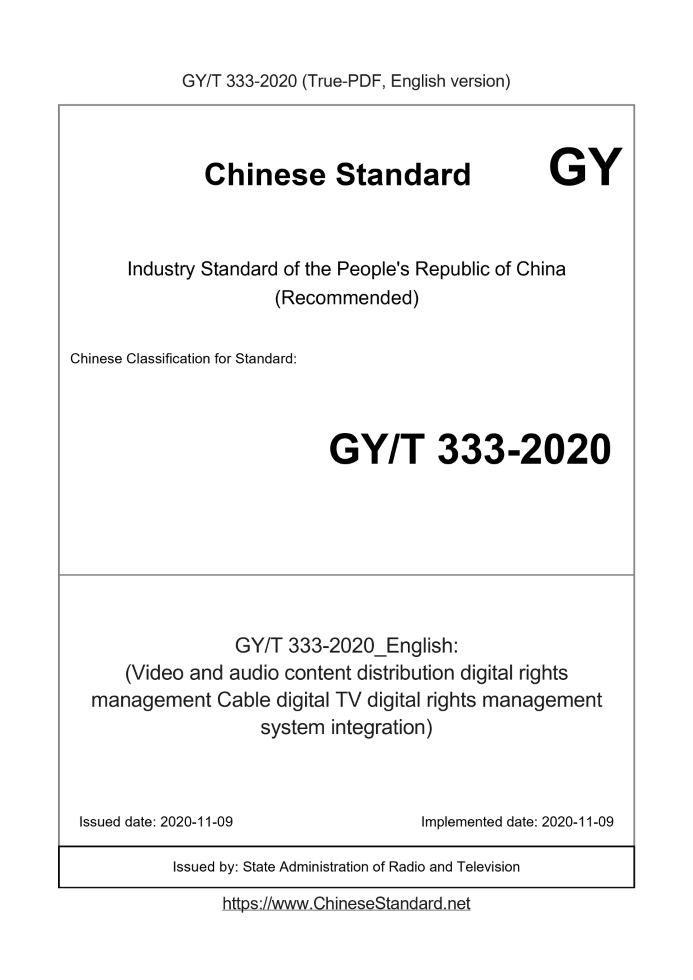 Delivery: <= 5 days. True-PDF full-copy in English will be manually translated and delivered via email. GY/T 333-2020: (Video and audio content distribution digital rights management Cable digital TV digital rights management system integration) Status: Valid