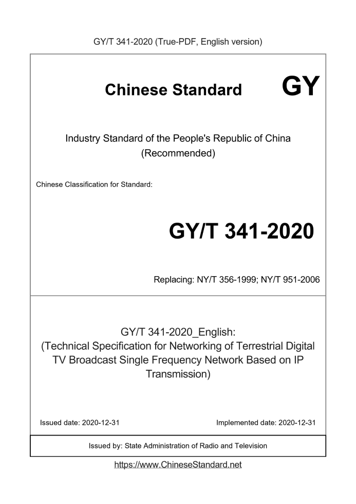 Delivery: <= 4 days. True-PDF full-copy in English will be manually translated and delivered via email. GY/T 341-2020: (Technical Specification for Networking of Terrestrial Digital TV Broadcast Single Frequency Network Based on IP Transmission) Status: Valid