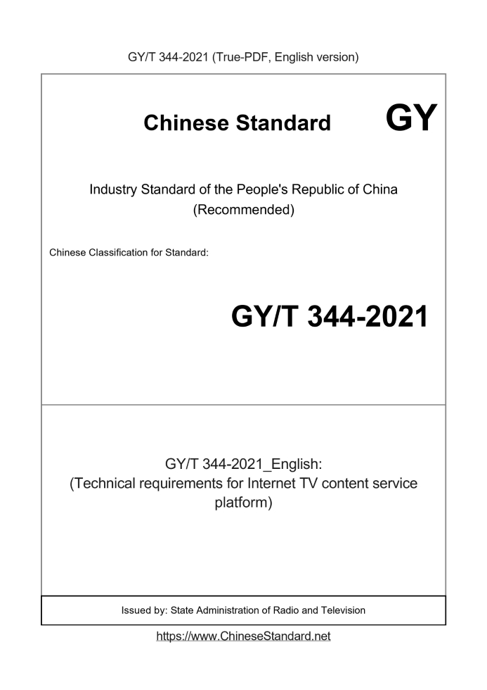 Delivery: <= 3 days. True-PDF full-copy in English will be manually translated and delivered via email. GY/T 344-2021: (Technical requirements for Internet TV content service platform) Status: Valid