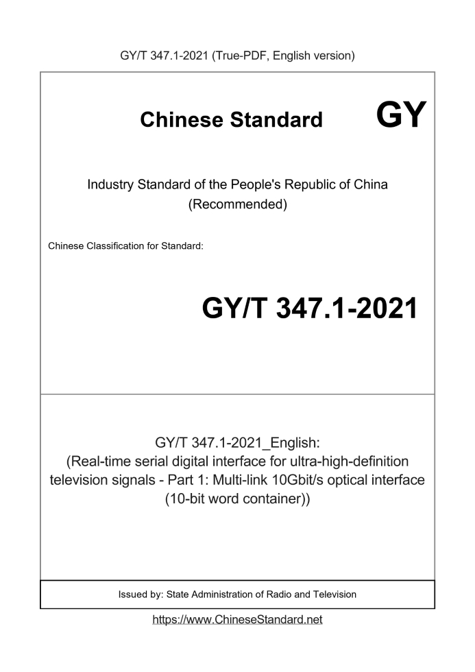 Delivery: <= 7 days. True-PDF full-copy in English will be manually translated and delivered via email. GY/T 347.1-2021: (Real-time serial digital interface for ultra-high-definition television signals - Part 1: Multi-link 10Gbit/s optical interface (10-bit word container)) Status: Valid