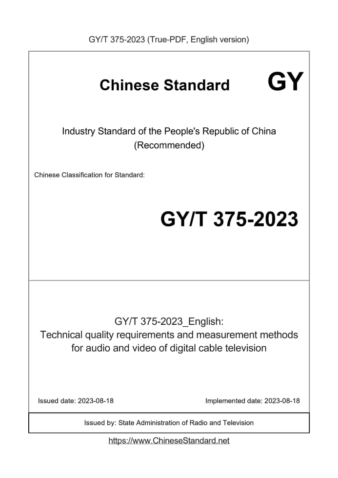 Delivery: <= 3 days. True-PDF full-copy in English will be manually translated and delivered via email. GY/T 375-2023: Technical quality requirements and measurement methods for audio and video of digital cable television Status: Valid