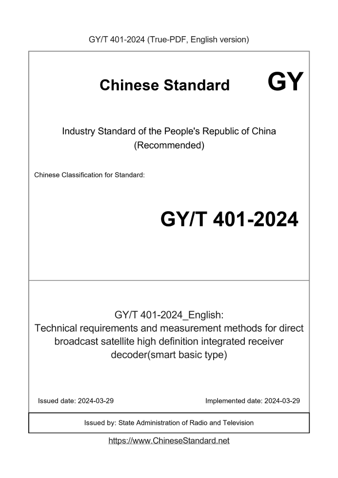 Delivery: <= 4 days. True-PDF full-copy in English will be manually translated and delivered via email. GY/T 401-2024: Technical requirements and measurement methods for direct broadcast satellite high definition integrated receiver decoder(smart basic type) Status: Valid
