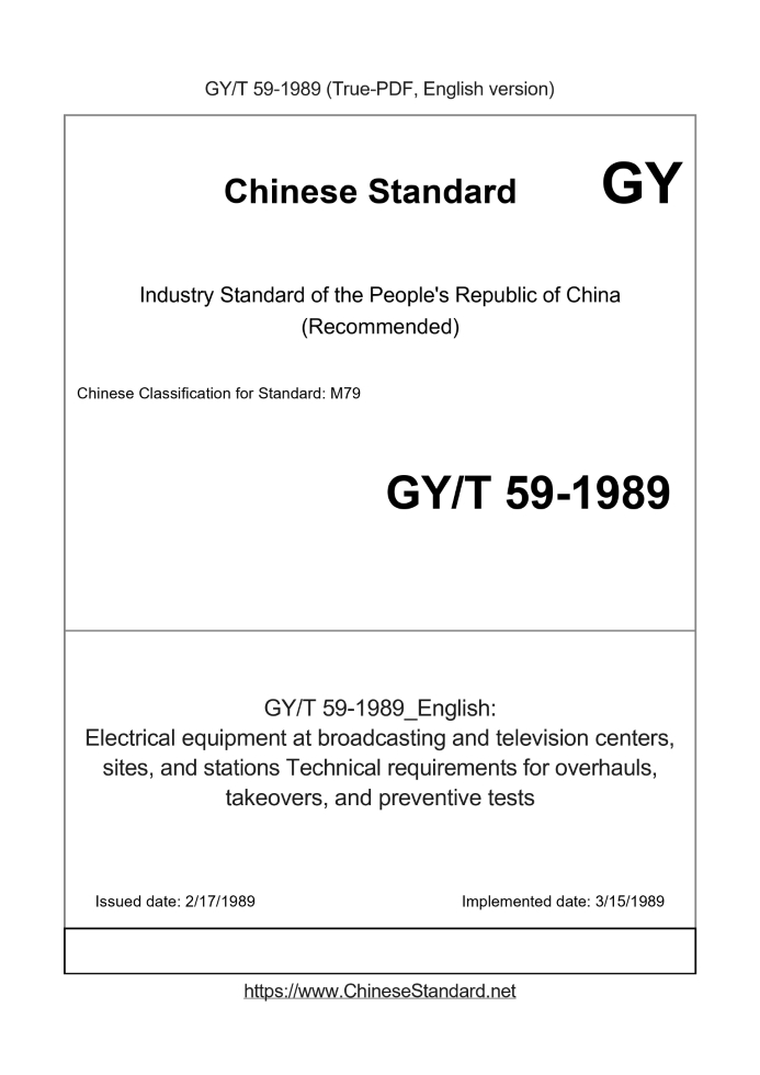 Delivery: <= 4 days. True-PDF full-copy in English will be manually translated and delivered via email. GY/T 59-1989: Electrical equipment at broadcasting and television centers, sites, and stations Technical requirements for overhauls, takeovers, and preventive tests