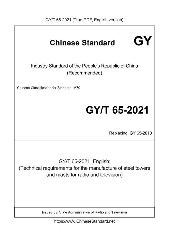 Delivery: <= 7 days. True-PDF full-copy in English will be manually translated and delivered via email. GY/T 65-2021: (Technical requirements for the manufacture of steel towers and masts for radio and television) Status: Valid GY/T 65: Historical versions