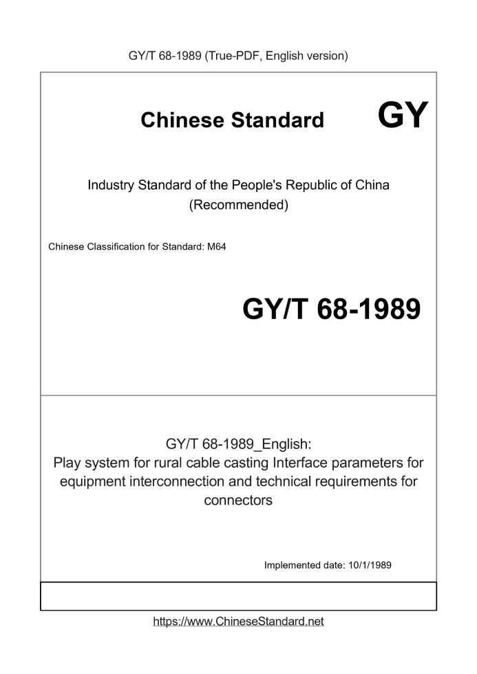Delivery: <= 3 days. True-PDF full-copy in English will be manually translated and delivered via email. GY/T 68-1989: Play system for rural cable casting Interface parameters for equipment interconnection and technical requirements for connectors Status: Obsolete