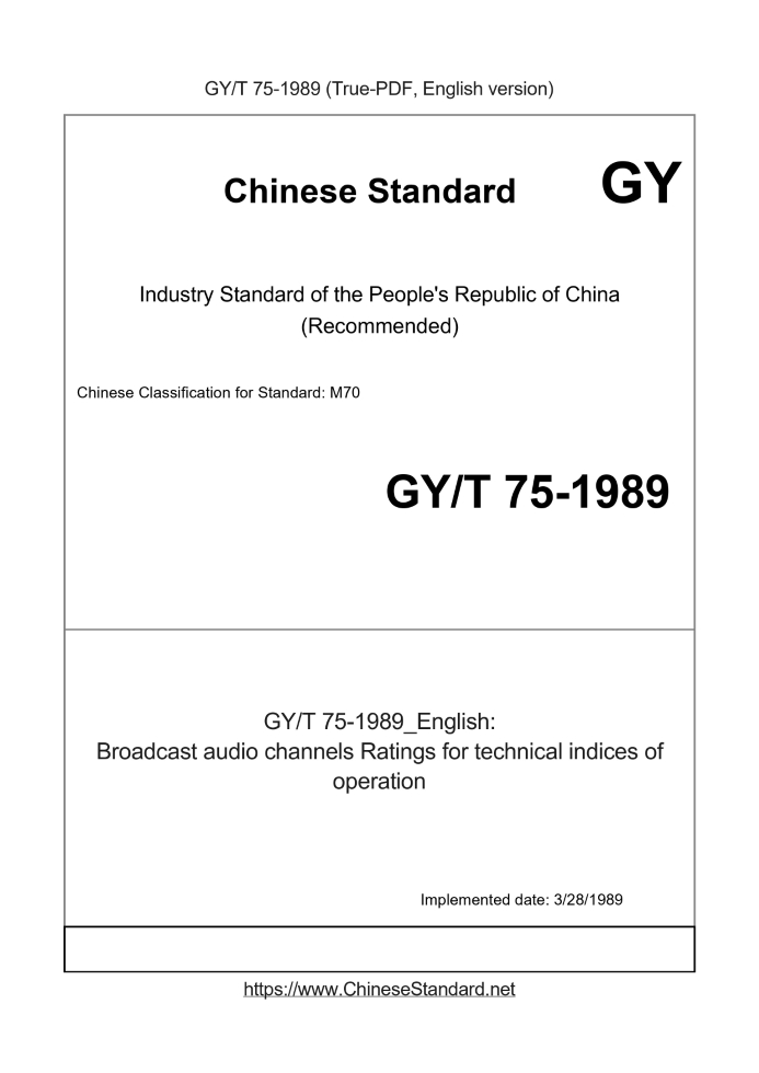Delivery: <= 2 days. True-PDF full-copy in English will be manually translated and delivered via email. GY/T 75-1989: Broadcast audio channels Ratings for technical indices of operation