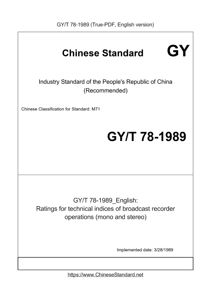 Delivery: <= 3 days. True-PDF full-copy in English will be manually translated and delivered via email. GY/T 78-1989: Ratings for technical indices of broadcast recorder operations (mono and stereo) Status: Obsolete