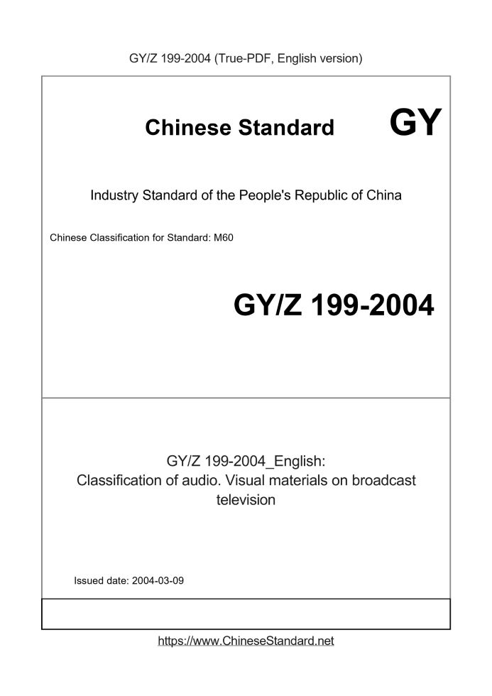 Delivery: <= 7 days. True-PDF full-copy in English will be manually translated and delivered via email. GYZ199-2004: Classification of audio. Visual materials on broadcast television Status: Valid
