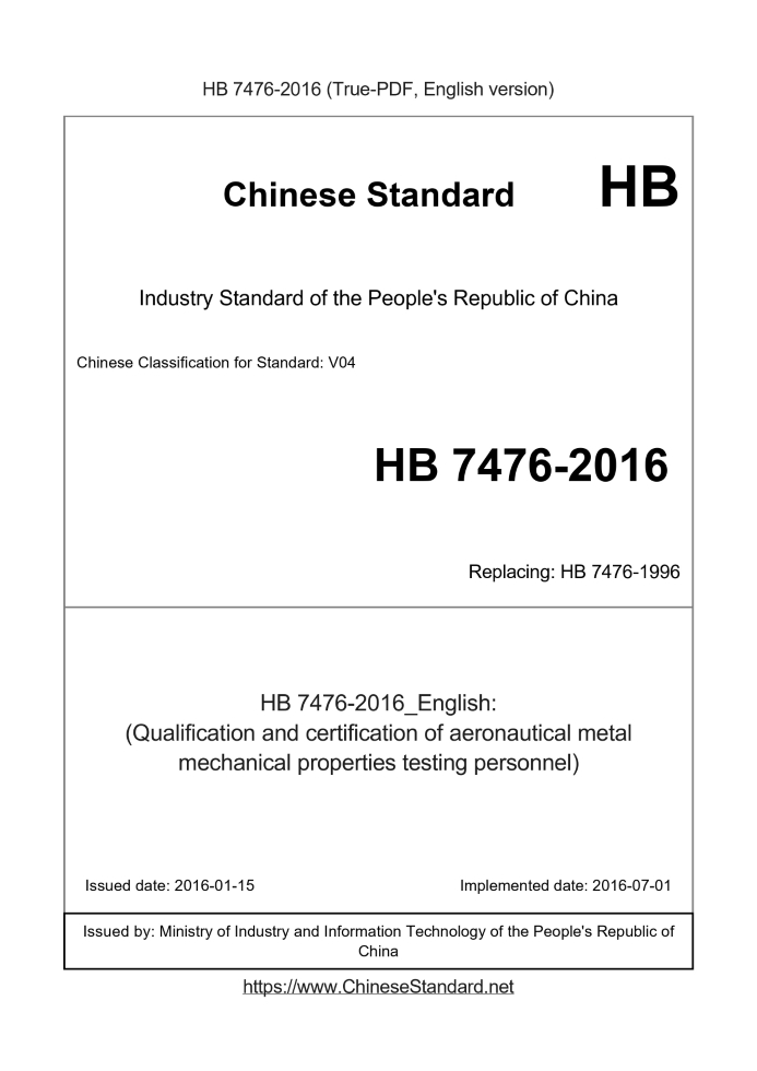 Basic dataStandard ID: HB 7476-2016 (HB7476-2016)Description (Translated English): (Qualification and certification of aeronautical metal mechanical properties testing personnel) Sector / Industry: Aviation Industry Standard Classification of Chinese Standard: V04 Date of Issue: 2016-01-15 Date of Implementation: 2016-07-01 Older Standard (superseded by this standard): HB 7476-1996 Regulation (derived from): ?Ministry of Industry and Information Technology Bulletin 2016 No.3 Issuing agency(ies): Ministry of Industry and Information Technology of the People's Republic of China Summary: This standard specifies the technical level, requirements and responsibilities of qualification and certification of aerospace metal mechanics testing personnel, qualification organization and responsibilities, conditions for applicants, training, examinations, technical qualification certificates and validity periods, files, etc. Tips & Frequently Asked Questions:Question 1: How long will the true-PDF of HB7476-2016_English be delivered?Answer: Upon your order, we will start to translate HB7476-2016_English as soon as possible, and keep you informed of the progress. The lead time is typically 1 ~ 3 working days. The lengthier the document the longer the lead time.Question 2: Can I share the purchased PDF of HB7476-2016_English with my colleagues?Answer: Yes. The purchased PDF of HB7476-2016_English will be deemed to be sold to your employer/organization who actually pays for it, including your colleagues and your employer's intranet.Question 3: Does the price include tax/VAT?Answer: Yes. Our tax invoice, downloaded/delivered in 9 seconds, includes all tax/VAT and complies with 100+ countries' tax regulations (tax exempted in 100+ countries) -- See Avoidance of Double Taxation Agreements (DTAs): List of DTAs signed between Singapore and 100+ countriesQuestion 4: Do you accept my currency other than USD?Answer: Yes. If you need your currency to be printed on the invoice, please write an email to Sales@ChineseStandard.net. In 2 working-hours, we will create a special link for you to pay in any currencies. Otherwise, follow the normal steps: Add to Cart -- Checkout -- Select your currency to pay. |