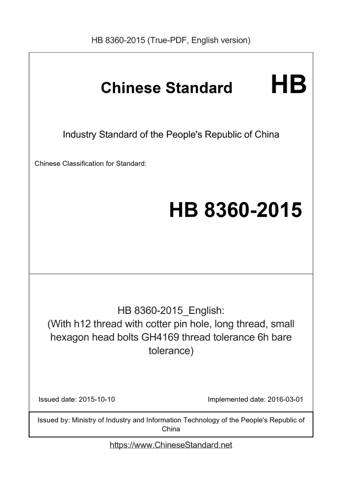 Delivery: <= 3 days. True-PDF full-copy in English will be manually translated and delivered via email. HB 8360-2015: (With h12 thread with cotter pin hole, long thread, small hexagon head bolts GH4169 thread tolerance 6h bare tolerance) Status: Valid