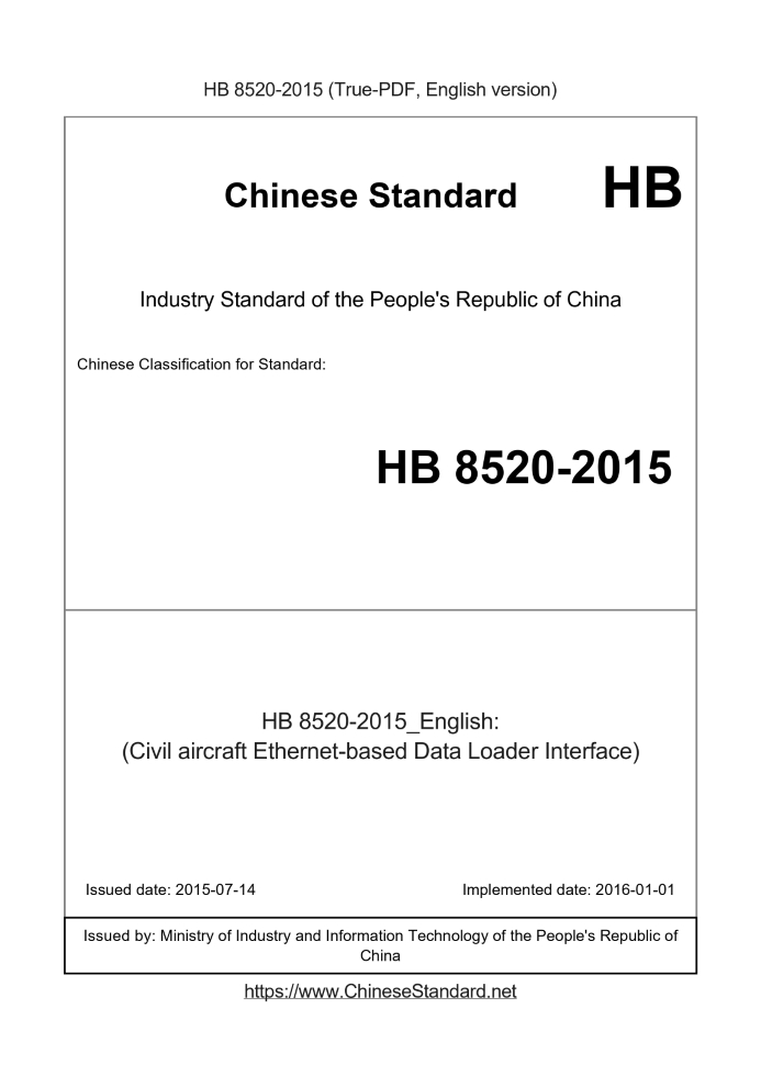 Basic dataStandard ID: HB 8520-2015 (HB8520-2015)Description (Translated English): (Civil aircraft Ethernet-based Data Loader Interface) Sector / Industry: Aviation Industry Standard Date of Issue: 2015-07-14 Date of Implementation: 2016-01-01 Regulation (derived from): PRC MIIT Announcement (2015 No.49) Issuing agency(ies): Ministry of Industry and Information Technology of the People's Republic of China Tips & Frequently Asked Questions:Question 1: How long will the true-PDF of HB 8520-2015_English be delivered?Answer: Upon your order, we will start to translate HB 8520-2015_English as soon as possible, and keep you informed of the progress. The lead time is typically 1 ~ 3 working days. The lengthier the document the longer the lead time.Question 2: Can I share the purchased PDF of HB 8520-2015_English with my colleagues?Answer: Yes. The purchased PDF of HB 8520-2015_English will be deemed to be sold to your employer/organization who actually pays for it, including your colleagues and your employer's intranet.Question 3: Does the price include tax/VAT?Answer: Yes. Our tax invoice, downloaded/delivered in 9 seconds, includes all tax/VAT and complies with 100+ countries' tax regulations (tax exempted in 100+ countries) -- See Avoidance of Double Taxation Agreements (DTAs): List of DTAs signed between Singapore and 100+ countriesQuestion 4: Do you accept my currency other than USD?Answer: Yes. If you need your currency to be printed on the invoice, please write an email to Sales@ChineseStandard.net. In 2 working-hours, we will create a special link for you to pay in any currencies. Otherwise, follow the normal steps: Add to Cart -- Checkout -- Select your currency to pay. |