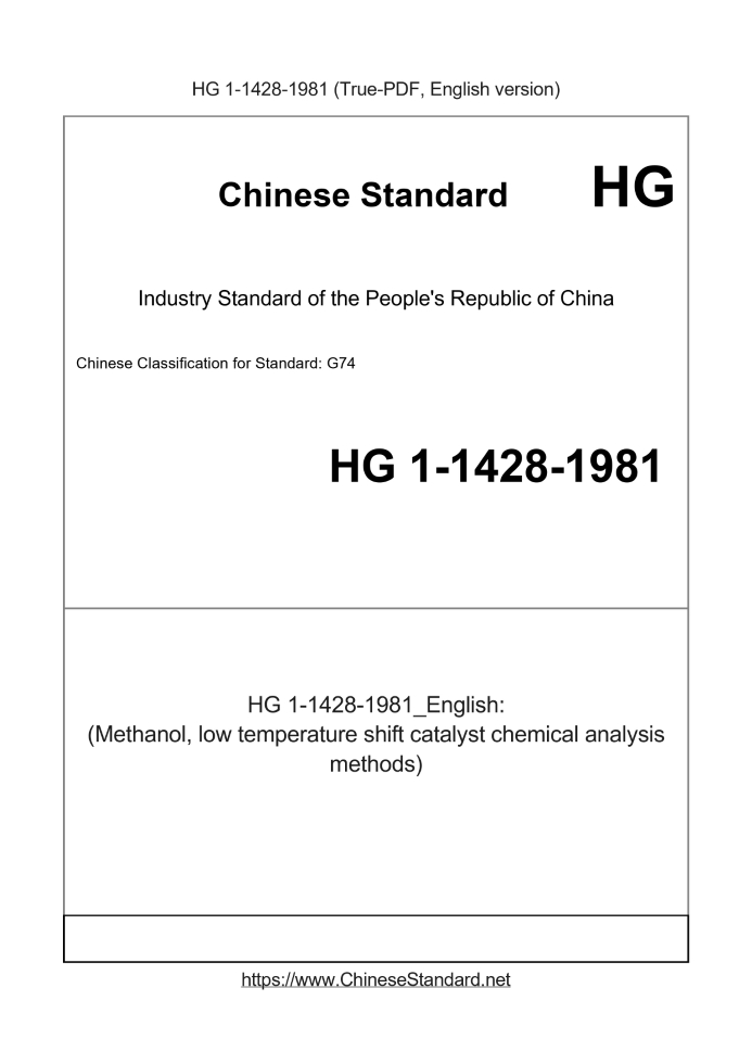 Delivery: <= 3 days. True-PDF full-copy in English will be manually translated and delivered via email. HG 1-1428-1981: (Methanol, low temperature shift catalyst chemical analysis methods) Status: Obsolete