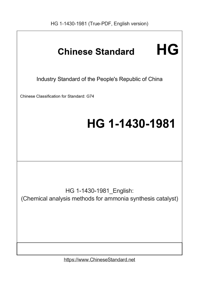 Delivery: <= 4 days. True-PDF full-copy in English will be manually translated and delivered via email. HG 1-1430-1981: (Chemical analysis methods for ammonia synthesis catalyst) Status: Obsolete