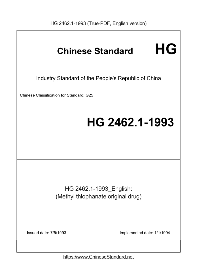 Delivery: <= 3 days. True-PDF full-copy in English will be manually translated and delivered via email. HG 2462.1-1993: (Methyl thiophanate original drug) Status: Obsolete